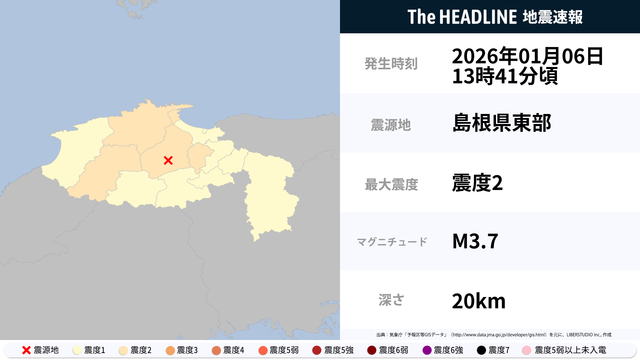 01月06日13時41分頃、島根県東部を震源とするマグニチュード3.7の地震が観測された。最大震度2を観測したのは、鳥取県・島根県。