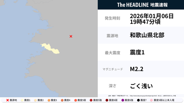 1月6日19時47分頃、和歌山県で最大震度1の地震を観測