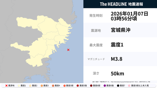 01月07日03時56分頃、宮城県沖を震源とするマグニチュード3.8の地震が観測された。最大震度1を観測したのは、岩手県・宮城県。