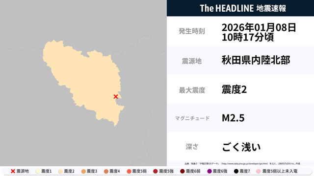 1月8日10時17分頃、秋田県内陸北部を震源とするマグニチュード2.5の地震が観測された。最大震度2を観測したのは、秋田県。