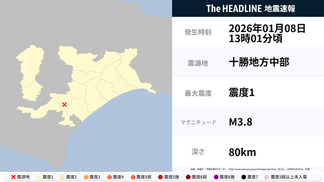 1月8日13時1分頃、十勝地方中部を震源とするマグニチュード3.8の地震が観測された。最大震度1を観測したのは、北海道。