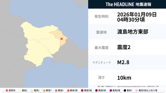 1月9日4時30分頃、渡島地方東部を震源とするマグニチュード2.8の地震が観測された。最大震度2を観測したのは、北海道。