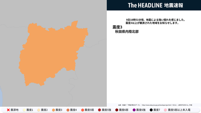 1月9日18時51分頃、秋田県内陸北部で震度3以上の地震を観測した。現時点の発表では、秋田県内陸北部で最大震度3の観測が発表されている。