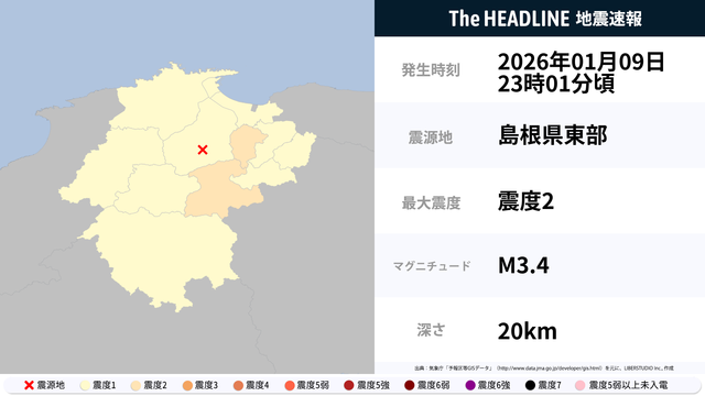 01月09日23時01分頃、島根県東部を震源とするマグニチュード3.4の地震が観測された。最大震度2を観測したのは、鳥取県。