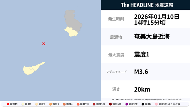 01月10日14時15分頃、奄美大島近海を震源とするマグニチュード3.6の地震が観測された。最大震度1を観測したのは、鹿児島県。