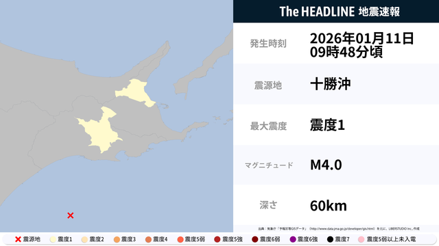 1月11日9時48分頃、十勝沖を震源とするマグニチュード4.0の地震が観測された。最大震度1を観測したのは、北海道。