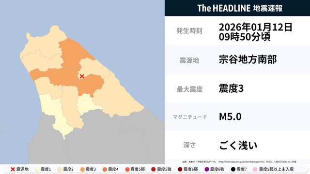 1月12日9時50分頃、北海道で最大震度3の地震を観測