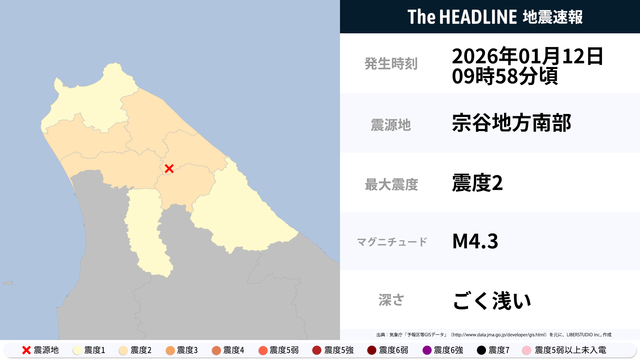 1月12日9時58分頃、宗谷地方南部を震源とするマグニチュード4.3の地震が観測された。最大震度2を観測したのは、北海道。
