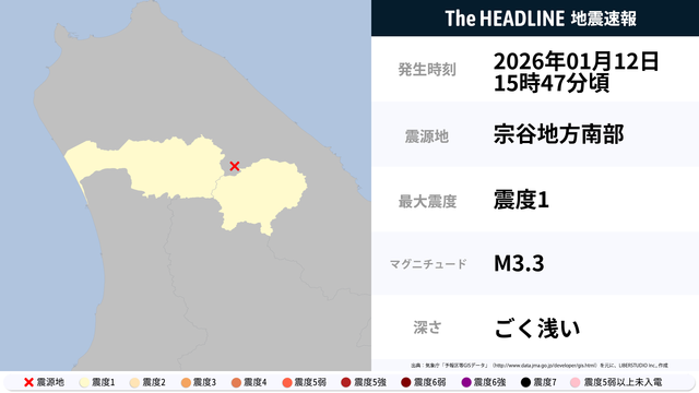 1月12日15時47分頃、北海道で最大震度1の地震を観測