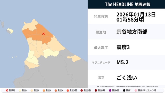 1月13日1時58分頃、宗谷地方南部を震源とするマグニチュード5.2の地震が観測された。最大震度3を観測したのは、北海道。