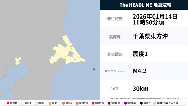 1月14日11時50分頃、千葉県東方沖を震源とするマグニチュード4.2の地震が観測された。最大震度1を観測したのは、茨城県・千葉県。