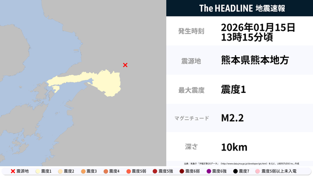 1月15日13時15分頃、熊本県熊本地方を震源とするマグニチュード2.2の地震が観測された。最大震度1を観測したのは、熊本県。