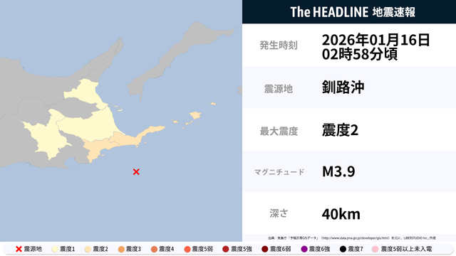 01月16日02時58分頃、釧路沖を震源とするマグニチュード3.9の地震が観測された。最大震度2を観測したのは、北海道。