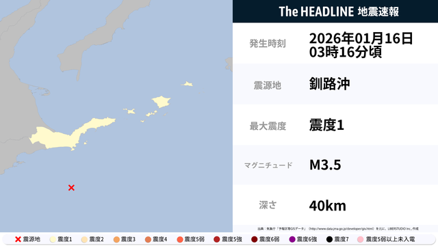 1月16日3時16分頃、釧路沖を震源とするマグニチュード3.5の地震が観測された。最大震度1を観測したのは、北海道。