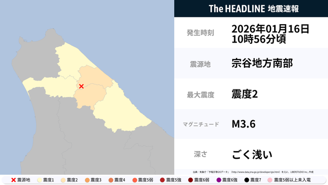 01月16日10時56分頃、宗谷地方南部を震源とするマグニチュード3.6の地震が観測された。最大震度2を観測したのは、北海道。