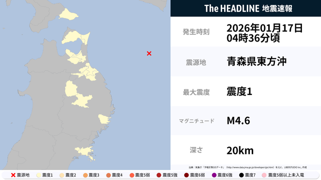 01月17日04時36分頃、青森県東方沖を震源とするマグニチュード4.6の地震が観測された。最大震度1を観測したのは、北海道・青森県など。