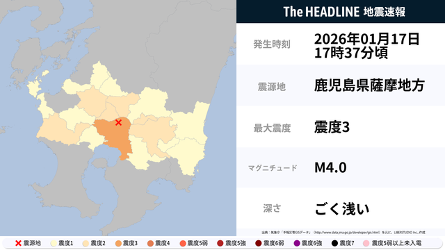 1月17日17時37分頃、鹿児島県薩摩地方を震源とするマグニチュード4.0の地震が観測された。最大震度3を観測したのは、鹿児島県。