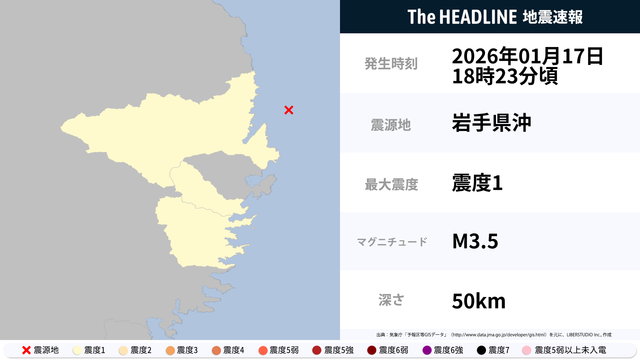 1月17日18時23分頃、岩手県沖を震源とするマグニチュード3.5の地震が観測された。最大震度1を観測したのは、岩手県。
