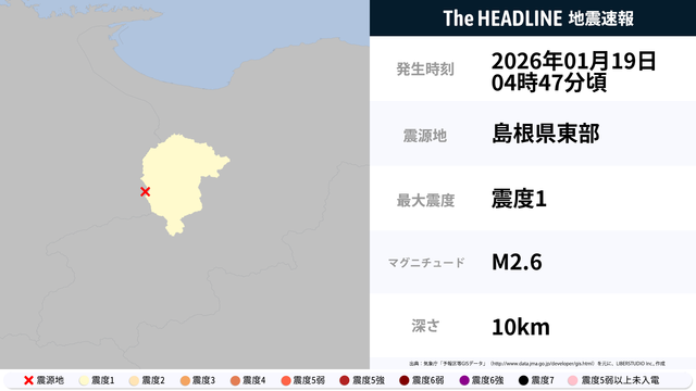 01月19日04時47分頃、島根県東部を震源とするマグニチュード2.6の地震が観測された。最大震度1を観測したのは、鳥取県。