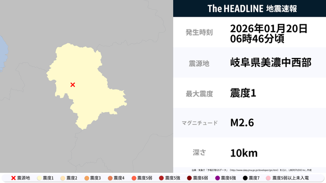 1月20日6時46分頃、岐阜県で最大震度1の地震を観測