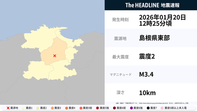 01月20日12時25分頃、島根県東部を震源とするマグニチュード3.4の地震が観測された。最大震度2を観測したのは、島根県。