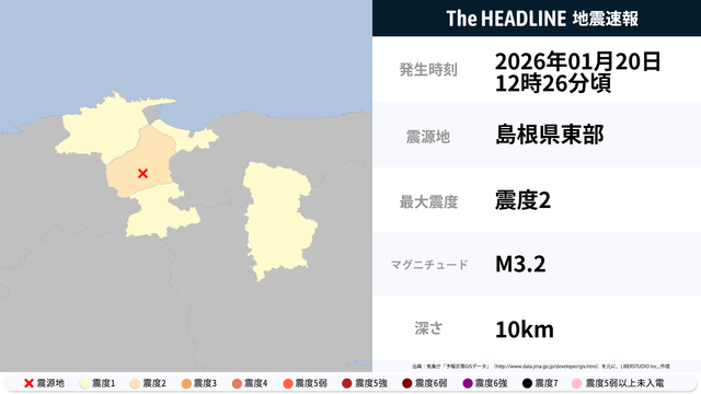 1月20日12時26分頃、島根県東部を震源とするマグニチュード3.2の地震が観測された。最大震度2を観測したのは、島根県。