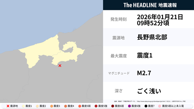 1月21日9時52分頃、長野県北部を震源とするマグニチュード2.7の地震が観測された。最大震度1を観測したのは、新潟県。