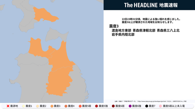 1月22日23時31分頃、北海道・青森県などで震度3以上の地震を観測
