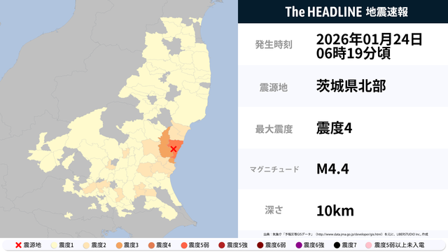 01月24日06時19分頃、茨城県北部を震源とするマグニチュード4.4の地震が観測された。最大震度4を観測したのは、茨城県。