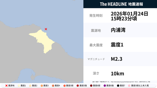 01月24日15時23分頃、内浦湾を震源とするマグニチュード2.3の地震が観測された。最大震度1を観測したのは、北海道。