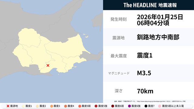 01月25日06時04分頃、釧路地方中南部を震源とするマグニチュード3.5の地震が観測された。最大震度1を観測したのは、北海道。
