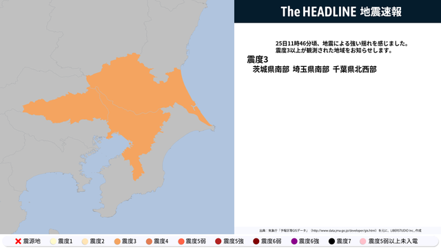 1月25日11時46分頃、茨城県・埼玉県などで震度3以上の地震を観測