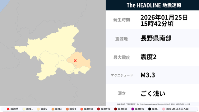 01月25日15時42分頃、長野県南部を震源とするマグニチュード3.3の地震が観測された。最大震度2を観測したのは、長野県。