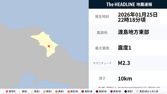 1月25日22時18分頃、渡島地方東部を震源とするマグニチュード2.3の地震が観測された。最大震度1を観測したのは、北海道。