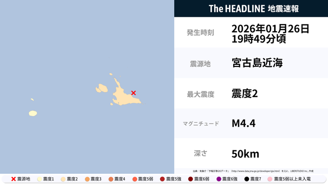 01月26日19時49分頃、宮古島近海を震源とするマグニチュード4.4の地震が観測された。最大震度2を観測したのは、沖縄県。