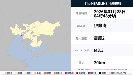 1月28日4時40分頃、愛知県で最大震度1の地震を観測