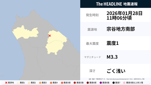 1月28日11時6分頃、宗谷地方南部を震源とするマグニチュード3.3の地震が観測された。最大震度1を観測したのは、北海道。