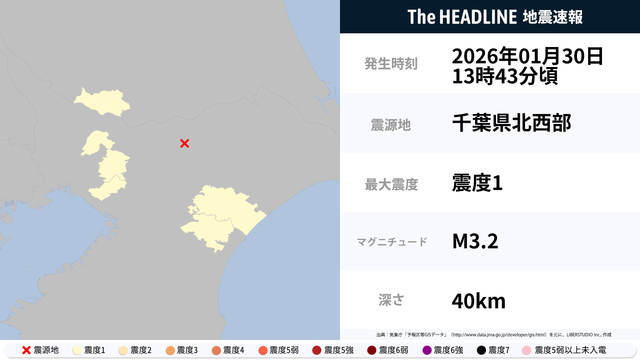 01月30日13時43分頃、千葉県北西部を震源とするマグニチュード3.2の地震が観測された。最大震度1を観測したのは、茨城県・千葉県。