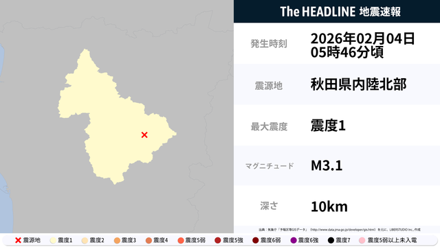 2月4日5時46分頃、秋田県内陸北部を震源とするマグニチュード3.1の地震が観測された。最大震度1を観測したのは、秋田県。