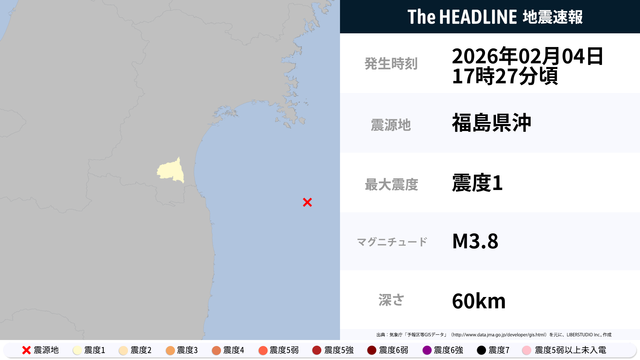 02月04日17時27分頃、福島県沖を震源とするマグニチュード3.8の地震が観測された。最大震度1を観測したのは、宮城県。