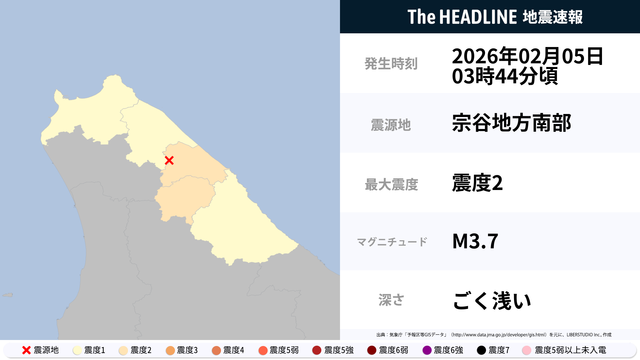 2月5日3時44分頃、北海道で最大震度2の地震を観測