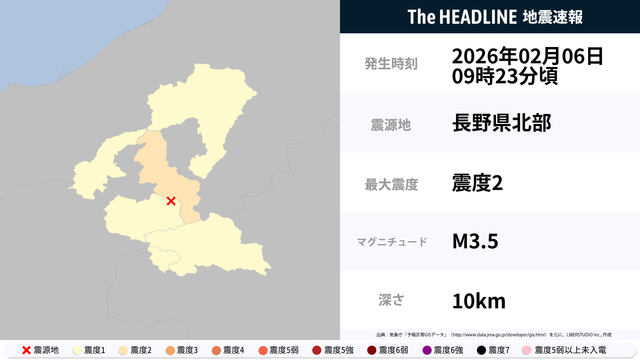 2月6日9時23分頃、長野県北部を震源とするマグニチュード3.5の地震が観測された。最大震度2を観測したのは、長野県。