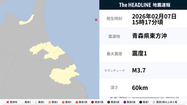 2月7日15時17分頃、青森県東方沖を震源とするマグニチュード3.7の地震が観測された。最大震度1を観測したのは、青森県・岩手県。