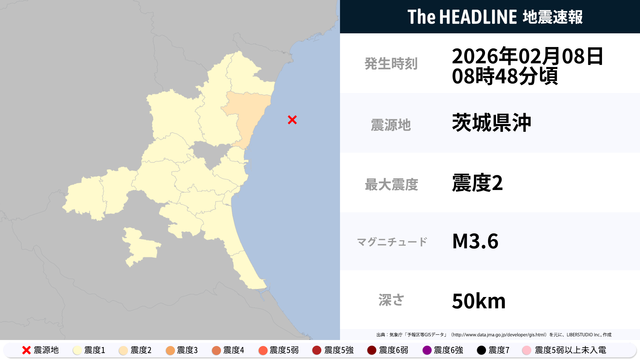 2月8日8時48分頃、茨城県沖を震源とするマグニチュード3.6の地震が観測された。最大震度2を観測したのは、茨城県。