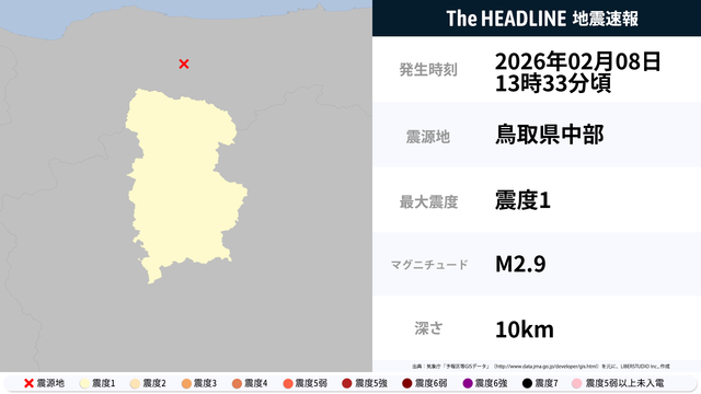 2月8日13時33分頃、鳥取県中部を震源とするマグニチュード2.9の地震が観測された。最大震度1を観測したのは、岡山県。