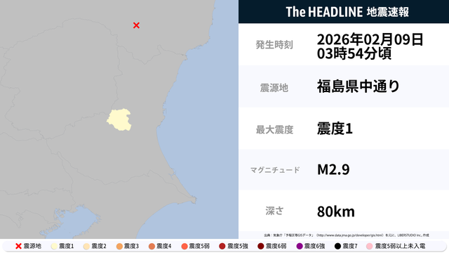 2月9日3時54分頃、福島県中通りを震源とするマグニチュード2.9の地震が観測された。最大震度1を観測したのは、茨城県。