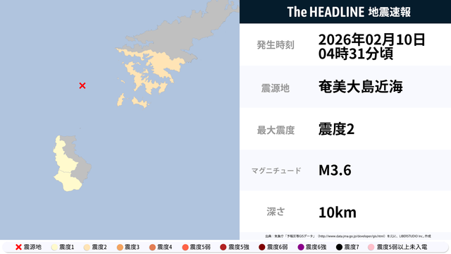 2月10日4時31分頃、奄美大島近海を震源とするマグニチュード3.6の地震が観測された。最大震度2を観測したのは、鹿児島県。