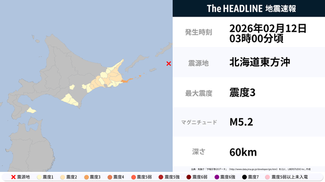 02月12日03時00分頃、北海道東方沖を震源とするマグニチュード5.2の地震が観測された。最大震度3を観測したのは、北海道。