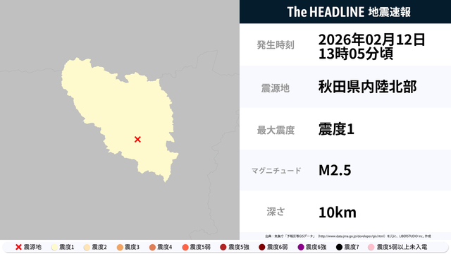 2月12日13時5分頃、秋田県内陸北部を震源とするマグニチュード2.5の地震が観測された。最大震度1を観測したのは、秋田県。