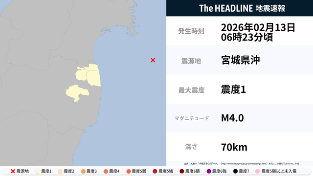 2月13日6時23分頃、宮城県沖を震源とするマグニチュード4.0の地震が観測された。最大震度1を観測したのは、福島県。